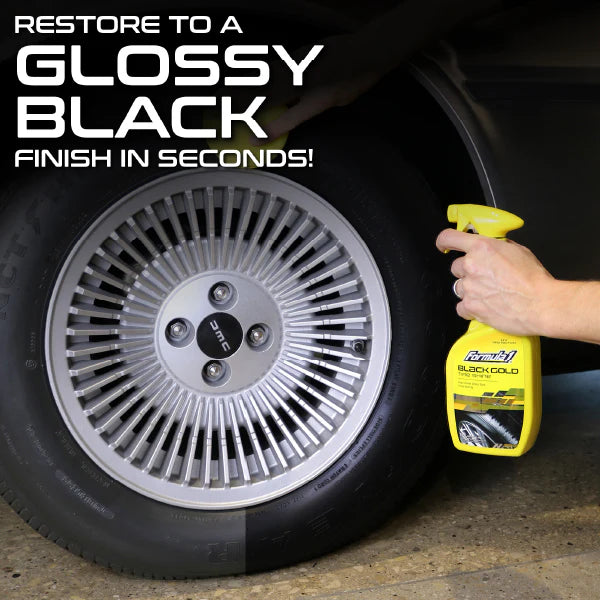 Formula 1 Black Gold provides a deep, high-gloss shine that lasts for weeks, helping to keep your tire's fresh black look and even protecting against weather's harmful conditions that can cause cracking and fading.