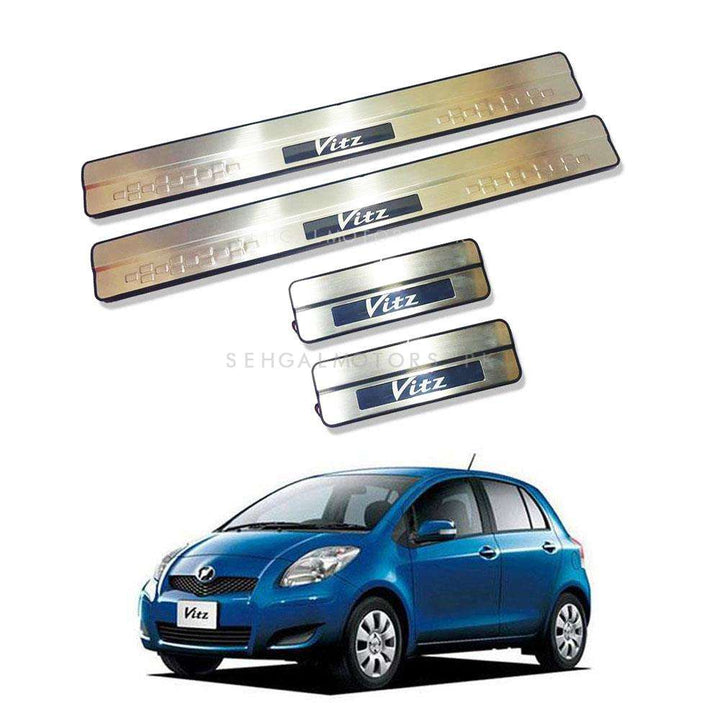 Toyota Vitz 2009 Door Sill Plates; Door Sill Plates is also known as door sill guards. Protects scuff marks from entering or exiting car.;Sill plates are essentially placed in cars to protect the door frames from wear and tear. These car accessories are located at the place where the door meets the frame. This way, your car door and frame remain protected against damage caused by suddenly slamming the doors of your car, or corrosion from water and dirt. Car sill plates may have a giant purpose to fulfill, but these can also make for great decorative accessories! You can choose to go the minimal way and opt for simple , conventional style car sill plates. However, for those of you that wish to give your car the royal treatment, you can always choose from colorful and illuminated sill plates. With lighted sill plates, every time you open your car door, these will light up. This way, your car looks decked up and you can walk in and out of your car, feeling like a big-shot.;These car accessories are generally made of materials like steel and aluminium which are very tough but likely to incur damage if left unattended for a considerable amount of time.